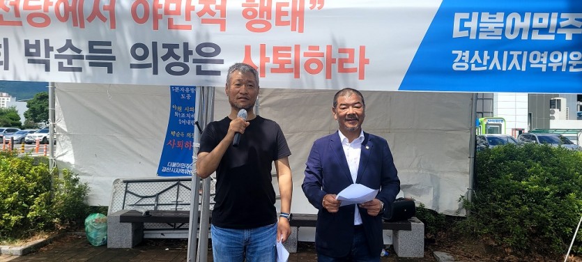 더불어민주당 경산지역 위원장 양재영과 이경원 의원은 지난 경산시의회 본회의장에서 일본의 후쿠시마 원전 오염수 해양방류와 관련한 이경원 의원의 사태와 관련 박순득 의장의 사퇴와 반민주적 횡포에 대해 천막농성으로 규탄했다.