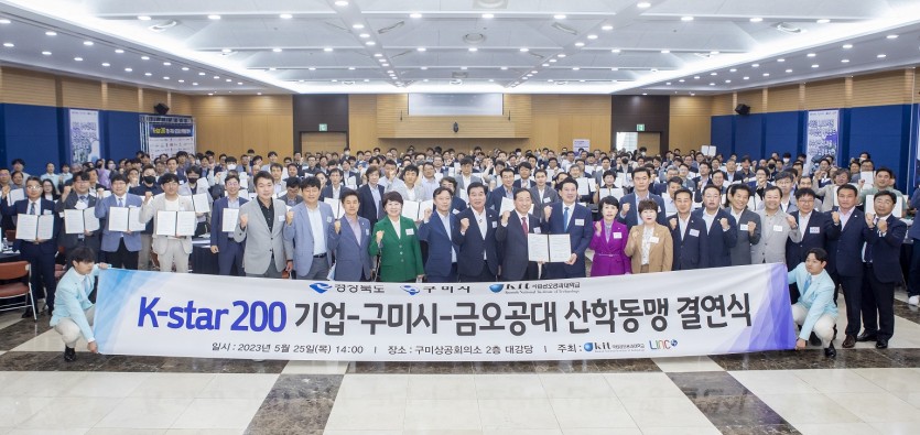 ‘금오공대-글로컬 혁신기업(K-star 200)-구미시 간 업무 협약식’에는 곽호상 금오공대 총장, 이달희 경북도 경제부지사, 김호섭 구미시 부시장을 비롯해 윤재호 주광정밀(주) 대표 등 지역 100개 유망기업 대표와 100명의 금오공대 교수, 그리고 각 기관 관계자 300여 명이 참석했다.