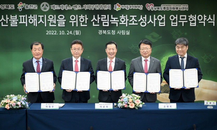 경북도는 도청 사림실에서 울진군, 메르세데스-벤츠 사회공헌위원회, 아이들과 미래재단, 경북종합자원봉사센터와 "경북 산불피해 지원을 위한 산림녹화조성사업 업무협약"을 체결하고 기부금 전달식을 개최했다고 24일 밝혔다.