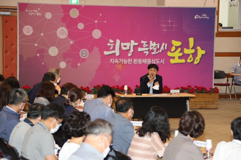 또한, 도시해양국은 △산단대개조 추진 △호미반도 국가해양정원 조성 △영일만 복합 해양레저관광도시 조성 등을, 건설교통사업본부는 △영일만대교 건설 △동해중부선 복선전철화 △북부권 버스 공영차고지 조성 등을, 맑은물사업본부는 △영일만산업단지 공업용수 공급 △공공하수처리 증설 등을 설명했다.