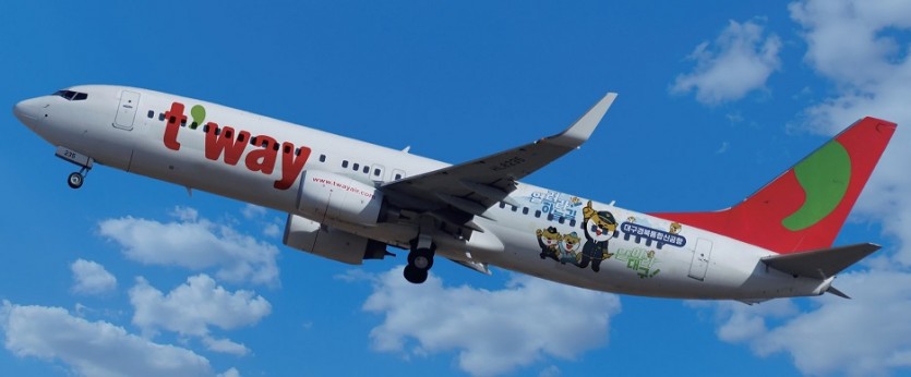 항공기 동체에 대구경북통합신공항 홍보용 래핑을 한 ㈜티웨이항공의 B737 항공기가 베트남 다낭에서 출발해 대구공항에 도착했다.