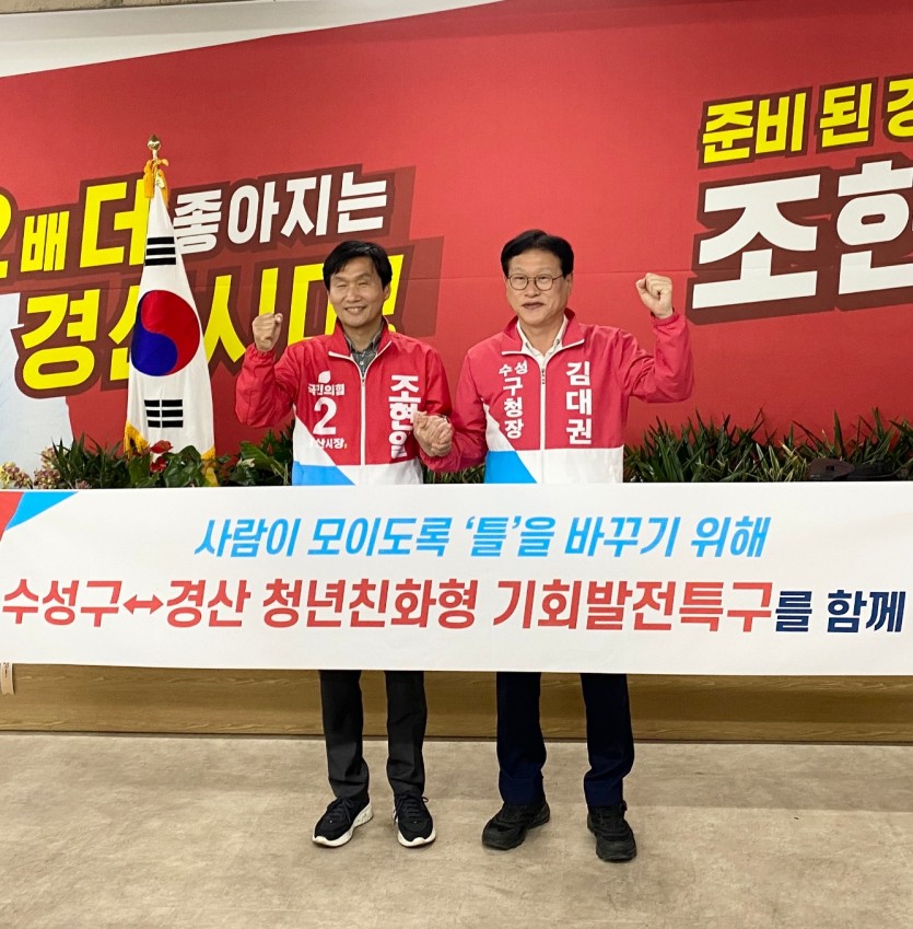 김대권 국민의힘 수성구청장 후보와 조현일 경북 경산시장 후보는 25일 오후 조 후보 선거사무소에서 만나 ‘수성구-경산시 청년친화형 기회발전특구’ 조성을 위한 상호 협력을 다짐했다고 밝혔다.