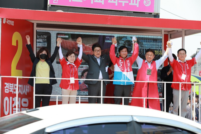 김정재 국민의힘 경북도당위원장은 시장후보, 도지사후보는 물론 함께한 도‧시의원 후보를 한 명씩 일일이 호명하며 “이들을 압도적으로 모두 당선시켜야 시원하게 일할 수 있다”고 주장했다.