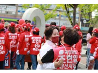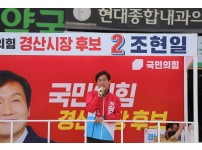 조 후보는 유세차에 올라 “살기 좋은 경산, 엄마가 행복한 경산, 기업하기 좋은 경산, 학생들이 행복한 경산을 만들겠다”는 각오와 함께, “경산 지하철 시대를 꼭 열겠다”는 포부를 밝혔다.