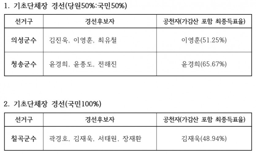 국민의힘 경북 의성, 청송, 칠곡군수 후보 경선결과 발표 작성일 22-05-09 페이지 정보 작성자관리자 조회 20,186회 댓글 0건 본문 국민의힘 경북도당공천관리위원회는 9일 기초단체장 경선 결과를 발표하고 후보자로 의결헸다고 밝혔다. 뉴스윈(jebo777@hanmail.net) 이전글 다음글 목록 댓글목록 댓글목록 등록된 댓글이 없습니다.