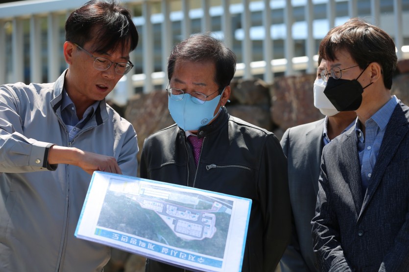 상동보 현장을 둘러본 홍 후보는 “1급수 수준으로 정수된 낙동강 물을 신천 상류에 사시사철 공급하고, 물놀이장과 휴식시설을 갖춰서 유난히 무더운 대구에서 시민들이 여름나기에 도움이 되는 신천을 만들어보겠다”고 말했다.