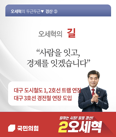 오 후보에 따르면 경산 시민이면 누구나 염원하고 모든 후보가 하나 같이 공약하는 대구도시철도 1, 2, 3호선의 완전 개통을 이루겠다고 전했다.