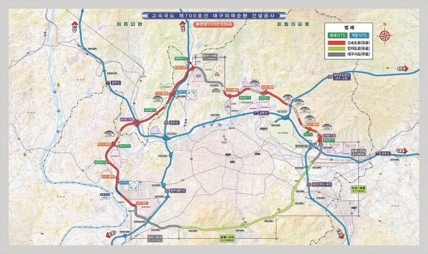 대구4차순환도로는 먼저 절반가량인 32.8km(민자 17.7km, 일반 15.1km)를 대구시가 1조 2천억 원을 투자 건설해 운영 중이며, 나머지 구간의 공사가 마무리되면서 65.7km 전 구간이 하나로 연결됐다.