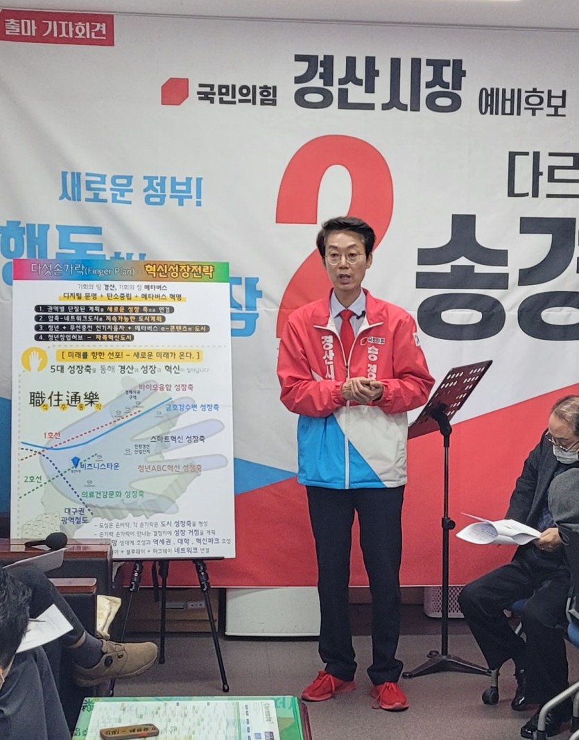 송 경산시장 예비후보는 14일 경산시를 방문해 기자회견을 통해 "오로지 경산 시민의 행복과 고향 경산의 미래만을 위해서 봉사하겠다는 신념으로 혁신과 열정으로 움직이는 도시경산을 만들겠다"고 각오를 밝혔다.