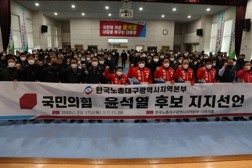 한국노총대구지역본부 산별대표자 및 노조간부는 17일 대구본부에서 지역경제 발전과 성장을 이끌어 낼 적임자로 정권교체를 염원하는 지지서명과 조합원의 뜻과 함께 국민의힘 윤석열 후보의 지지를 공식적으로 선언했다.