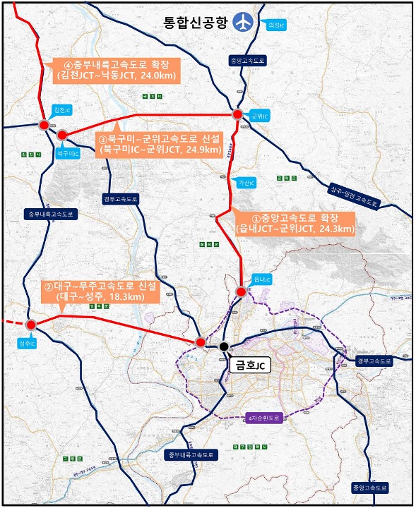 기존 4차로에서 6차로로 확장되는 2개 사업은 중앙고속도로 읍내 분기점~군위 분기점 24.3km(총사업비 6,092억) 구간과 중부내륙고속도로 김천 분기점~낙동 분기점 24km(총사업비 4,770억) 구간이며, 신설 고속도로 2개 사업은 대구~성주 18.3km(7,916억) 구간과 북구미 나들목~군위분기점 24.9km(1조 5,468억) 구간이다.
