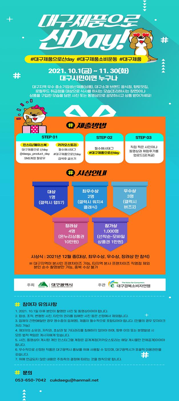 기타 자세한 사항은 대구제품으로산day, @daegu_product_day SNS를 통해 확인할 수 있으며, 대구경북소비자연맹이나 대구시 민생경제과(803-5341)로 문의하면 안내받을 수 있다.