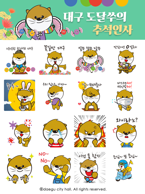 대구시가 제작한 ‘추석맞이 도달쑤 이모티콘’은 추석에 많이 사용하는 명절 안부인사 문구와 각 상황에 어울리는 ‘~대구’ 어투, 일상생활에 활용도가 높은 감정표현 동작 등 총 16종으로 구성했다.