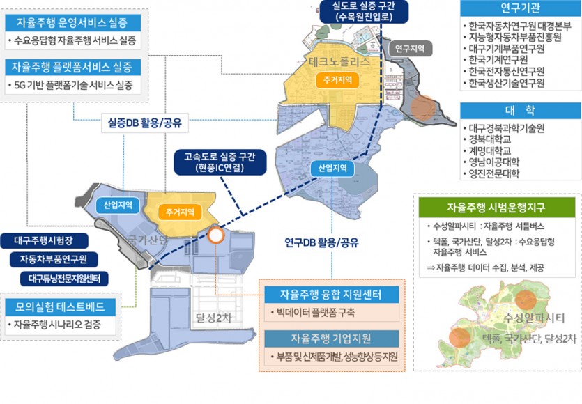 또한 수성알파시티, 테크노폴리스, 달성2차산업단지, 대구국가산업단지의 실도로에 자율주행 실증을 위한 여러 가지 기반 시설을 구축해 자율주행차의 조기 상용화를 위한 환경을 완성할 계획이다.