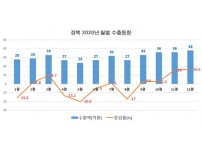9~12월 최근 4개월 연속 전년 대비 증가, 증가율도 지속 확대2021년에도 공격적인 경북수출에스오에스(SOS) 특별마케팅 추진경북도는 지난해 12월 수출이 전년 동기 대비 16.6% 증가한 38억 달러(약 4조 2천억원)를 기록하면서 11월에 이어 두 자릿수 증가율을 보였다.2020년 연간 총수출은 371억 달러로 전년 377억 달러 대비 1.6% 감소했지만 3분기부터 뚜렷한 회복세를 유지하면서 9월에는 33억 달러로 전년 동월 대비 3.6% 증가했고, 10월에는 36억 달러로 +2.5%, 11월에는 36억 달러로 +16.0%,…