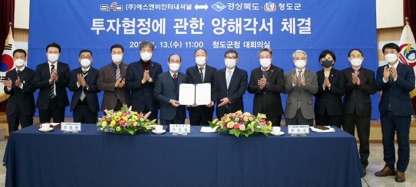 이날 투자양해각서 체결에는 오동환 ㈜에스앤비인터내셔널 대표, 하대성 경북도 경제부지사, 이승율 청도군수, 박권현 도의원, 김하수 도의원, 이선희 도의원, 김수태 군의장 등이 참석했다.