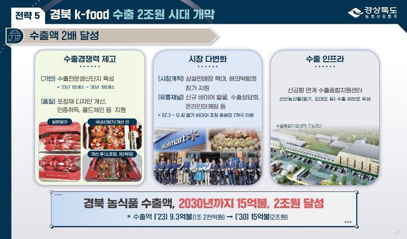 특히 2030년까지 농식품 수출 2조 원 달성을 목표로, 신선농산물과 가공식품의 해외시장 공략을 강화하며 산지유통조직 강화와 스마트 APC 25개소 건립을 통해 유통 전 과정을 디지털화해 유통비용 절감과 농가 소득 증대를 도모한다고 전했다.