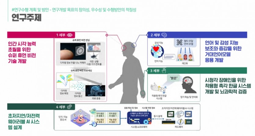 또한 주식회사 닷, 뷰노, 스트라드비젼, 폴라리스 3D, 퓨리오사AI 등의 기업들과 함께 슈퍼 휴먼비전(인간 시각 능력 초월) 기술, 언어 및 감성 지능 보조와 증강을 위한 거대언어모델 응용 기술, 시청각 장애인을 위한 착용형 촉각 한글 시스템 기술, 초저지연·저전력 웨어러블 AI시스템 설계 기술을 개발한다.
