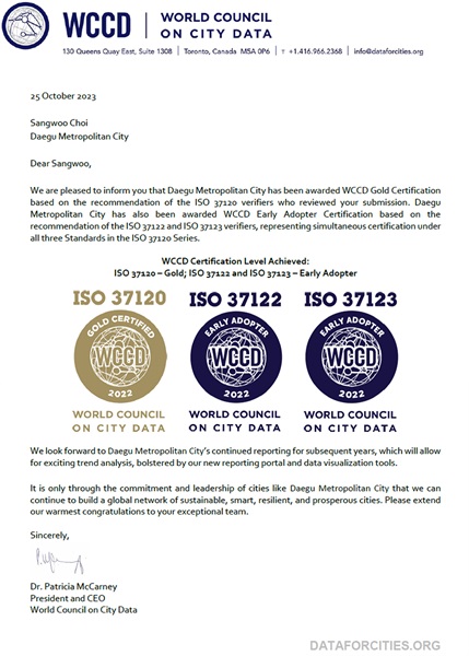 최운백 미래혁신성장실장은 “작년 국토교통부 스마트도시 인증 갱신과 이번 ISO 37120 시리즈 2년 연속 획득은 대구시의 스마트시티 관련 기술 및 서비스가 국내는 물론 국제적으로 통용될 수 있다는 것을 입증한 것이다”고 전했다.