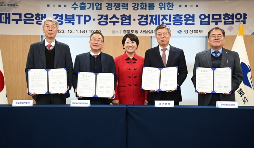 경북도는 지난 1일 수출 활성화를 위해 도내 수출지원기관인 경북수출기업협회, 경북도경제진흥원, 경북테크노파크, DGB대구은행과 함께 수출기업 경쟁력 강화 및 상생금융 실천을 위한 업무협약을 체결했다고 밝혔다.