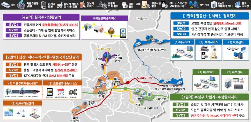 이를 위해 대구형 통합교통서비스플랫폼(MaaS)을 기반으로 자율주행셔틀 DRT(서대구KTX역~죽전역),로봇물류배송(역사 및 전통시장 인근 짐캐리),스마트모빌리티 허브센터(모빌리티환승통합연계), MaaS 빅데이터 플랫폼, 대중교통 마일리지 지역화폐형 지역경제 활성화한다.