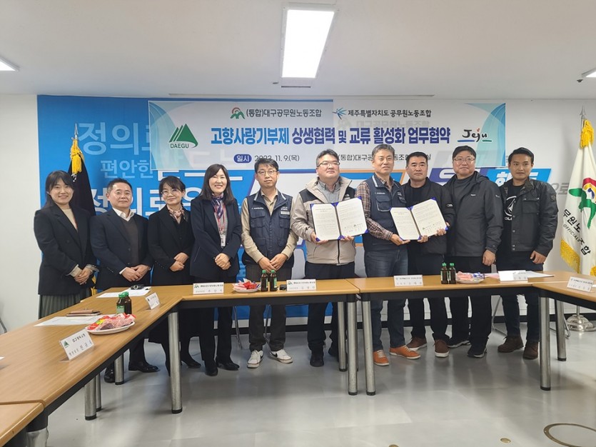 (통합)대구공무원노동조합과 제주특별자치도공무원노동조합은 고향사랑기부제를 통해 두 지역의 공동발전과 상생협력을 강화하기로 논의하고, 제주의 오태권 위원장 외 조합원들이 업무협약 체결을 위해 직접 대구광역시청을 방문함에 따라 두 지역의 만남이 성사됐다.
