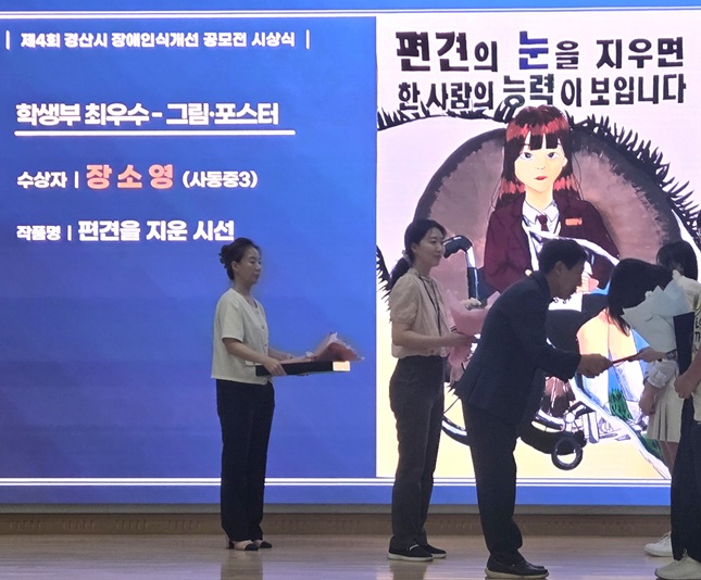 3학년 장○○ 학생은 ‘편견의 눈을 지우면 한 사람의 능력이 보입니다’라는 슬로건으로 최우수상, 2학년 김○○ 학생은 사계절을 주제로 장애인과의 공존을 표현한 포스터로 우수상을 수상했다.
