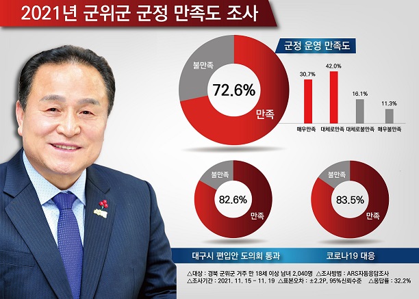 설문조사 결과 군정운영 만족도 72.6%, 대구시 편입안 경북도의회 통과 만족도 82.6%, 대구시 편입관련 군위군 업무추진 만족도 79.2%, 코로나19 대응 만족도 83.5% 등 군민들의 군정에 대한 만족도는 전반적으로 매우 높은 것으로 나타났다.