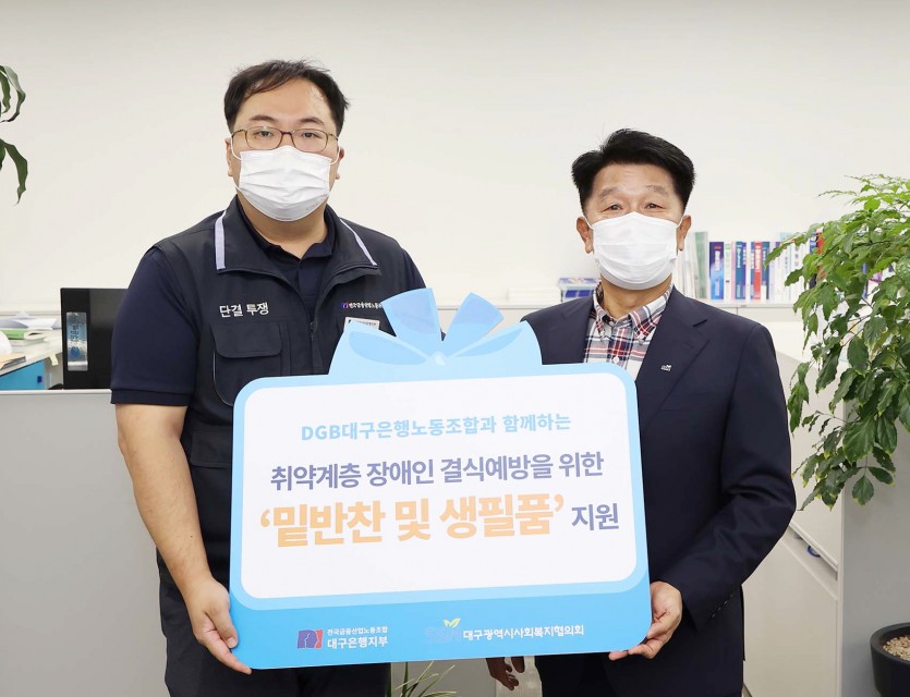 전국금융산업노동조합 대구은행지부(위원장 김정원)는 18일 취약계층 장애인을 위한 밑반찬 및 생필품 지원 사업을 위해 대구시 사회복지협의회에 성금 2천만원을 전달했다고 밝혔다.