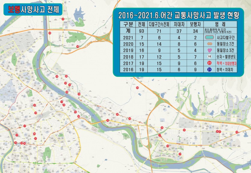 이번 "우리동네 교통안전지도제작"은 지난 2016년부터 2021년 현재까지의 5년간 누적된 교통사망사고 데이터를 활용해 연도별·장소별·유형별 다발구간을 반영한 각 지도 이미지를 한 개의 GIF 파일로 제작, 교통사고다발구간을 반복적으로 보여주어 시민들에 시각·효과적으로 정보를 전달하고자 한다.