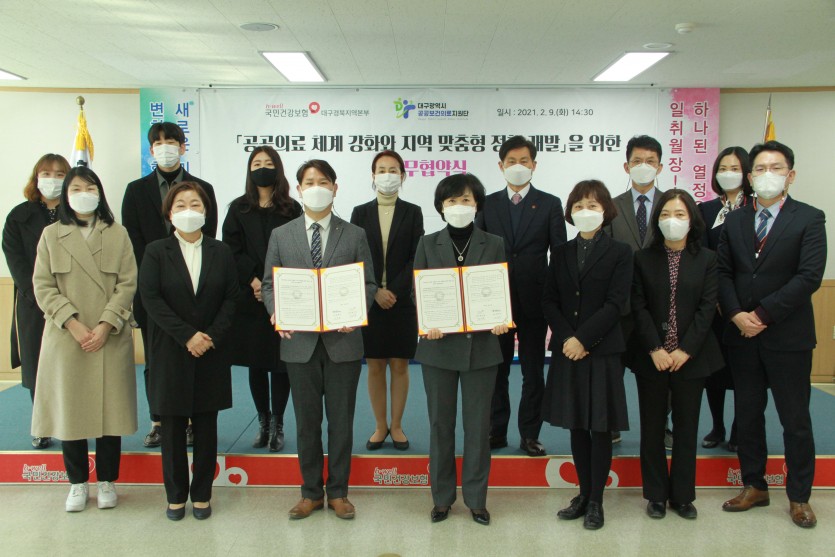 국민건강보험공단 대구경북지역본부는 9일  대구시 공공보건의료지원단과 ‘공공의료 체계 강화와 지역 맞춤형 정책 개발을 위한 업무협약(MOU)’을 체결했다고 밝혔다.