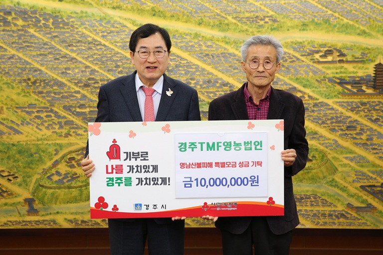 주낙영 경주시장은 “매년 나눔을 실천해주시는 경주 TMF영농법인에 깊이 감사드린다”며, “보내주신 성금은 이재민들의 삶의 터전을 복구하는 데 소중히 사용하겠다”고 전했다.