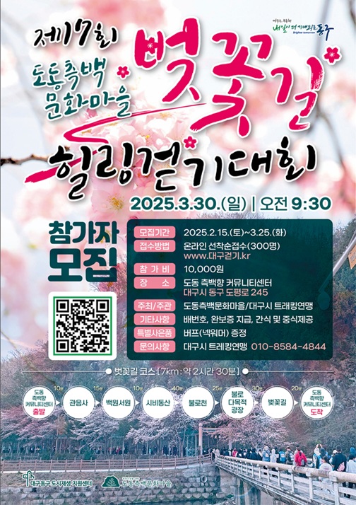이번 걷기대회는 벚꽃이 만개한 도동을 즐기며, 7km 코스를 따라 관음사, 백원서원, 시비동산, 불로천, 불로다목적광장 등을 경유하는 코스로 진행된다.