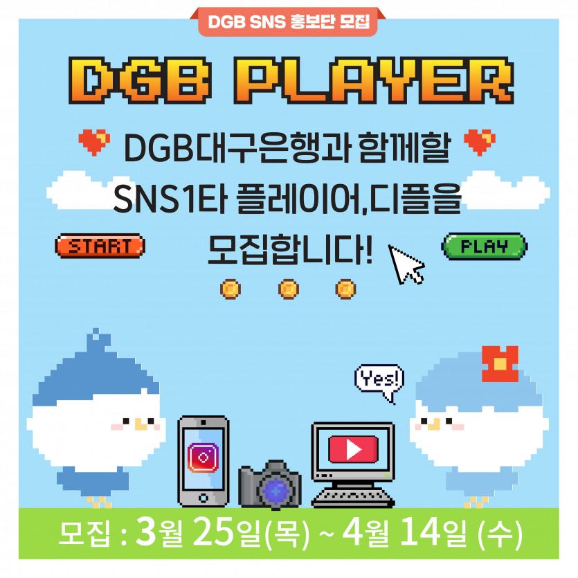 DGB대구은행은 디지털을 통한 소통 및 브랜드 이미지 제고를 위해 대국민 SNS 홍보단 ‘DGB Player : 디플’을 모집한다고 밝혔다.