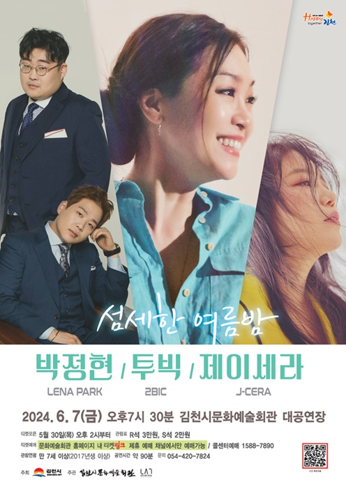 김천시 문화예술회관에서는 오는 6월 7일 오후 7시 30분 박정현, 투빅, 그리고 제이세라의 콘서트를 문화예술회관 대공연장에서 개최한다.