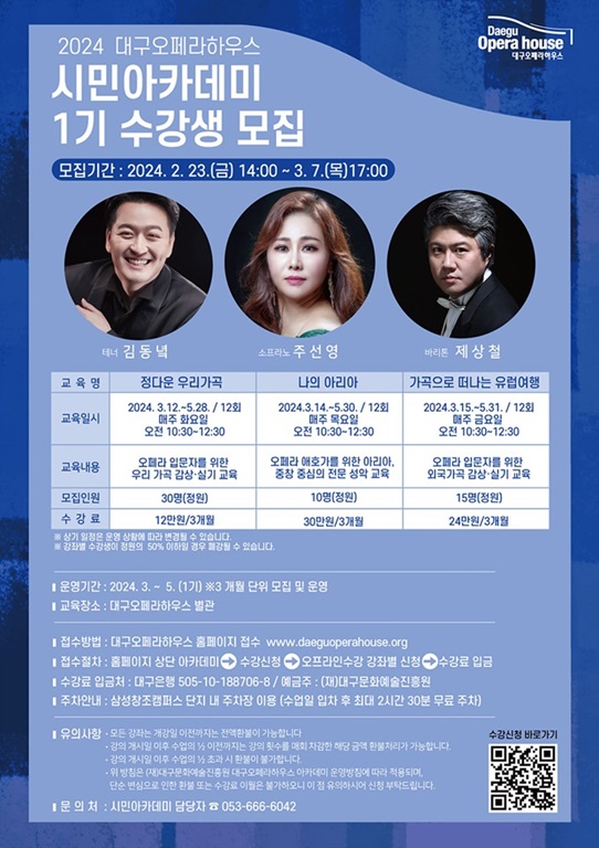 프로그램은 오페라 입문자부터 오페라 애호가에 이르기까지 많은 대구 시민들이 노래를 체계적이고 전문적으로 배워볼 수 있도록 구성돼 있으며 상세 내용 확인 및 수강신청은 오는 7일까지 대구오페라하우스 홈페이지에서 가능하다.
