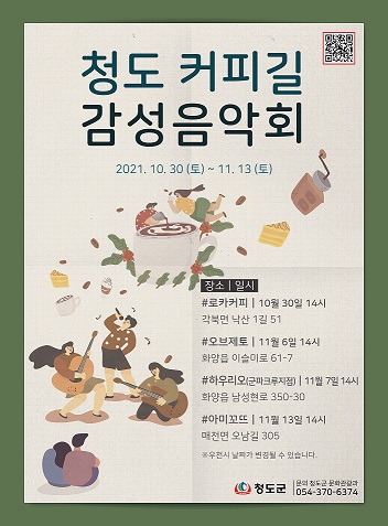 청도군은 오는 30일부터 11월 16일까지 군내 핫플레이스로 떠오르는 다양한 카페를 소개하고 코로나19로 침체된 관광산업을 활성화하고자 "청도 커피길 감성음악회"를 마련했다.