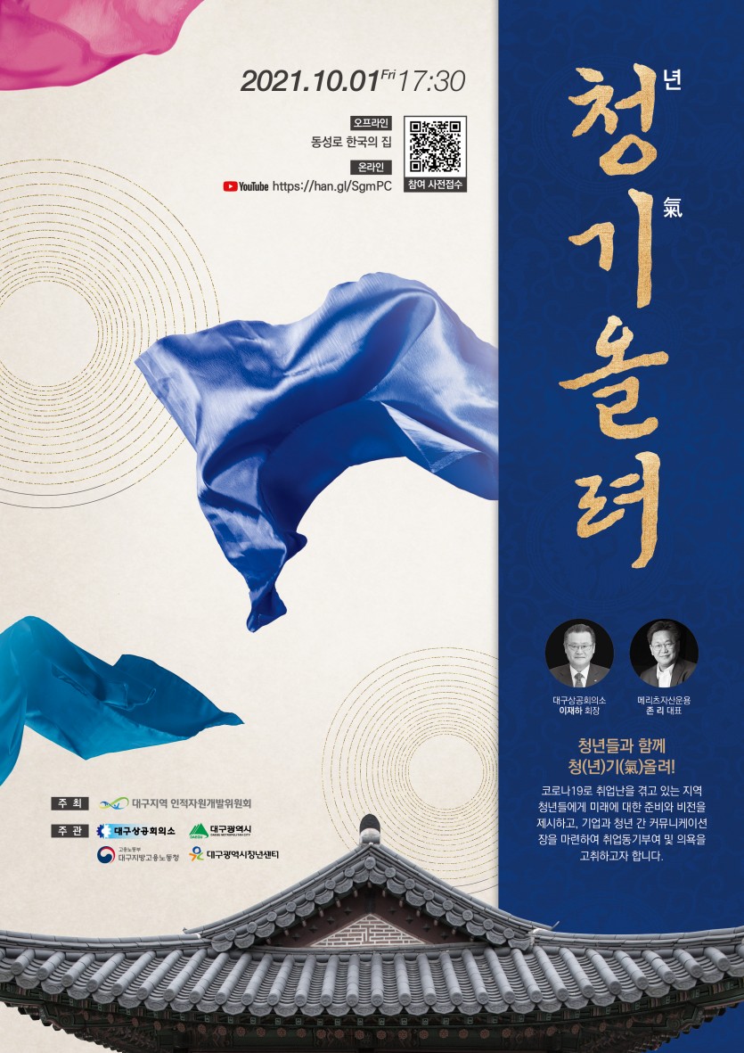대구상공회의소는 코로나19로 취업난을 겪고 있는 지역 청년의 기를 올려주기 위해 오는 1일 동성로 한국의집에서‘청(년)기(氣)올려 청년토크콘서트’를 개최한다.