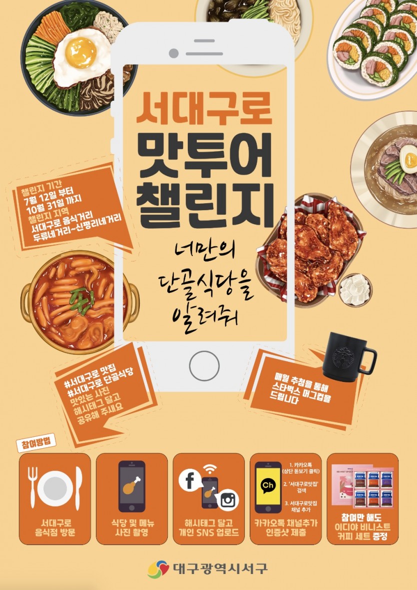 대구 서구청은 서대구로 음식거리 집중홍보를 위해 오는 12일부터 10월까지 서대구로 맛투어 챌린지 ‘너만의 단골식당을 알려줘!’ 이벤트를 진행한다고 밝혔다.