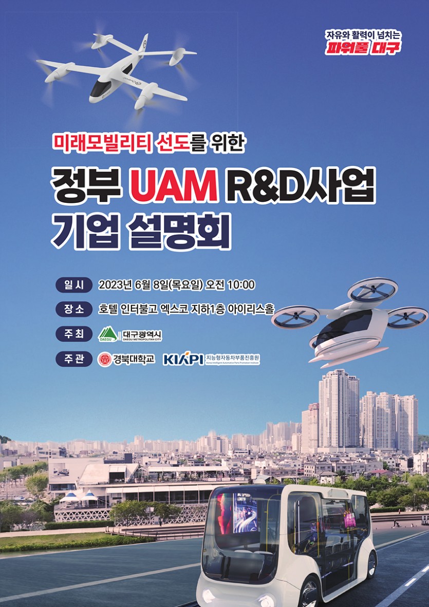 대구시는 8일 인터불고엑스코호텔에서 경북대학교 및 지능형자동차부품진흥원과 함께 100여 명의 산·학·연 관계자들이 참석한 가운데 ‘정부 UAM R&D 사업 기업설명회’를 개최한다고 밝혔다.