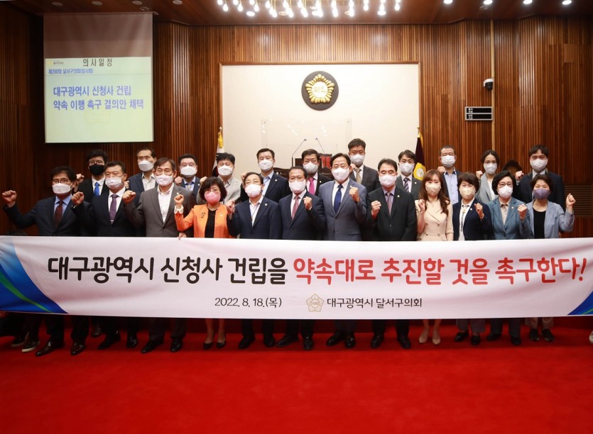 대구 달서구의회는 18일 "제290회 달서구의회 임시회"를 개최해 "대구광역시 신청사 건립 약속 이행 촉구 결의안"을 채택했다고 밝혔다.