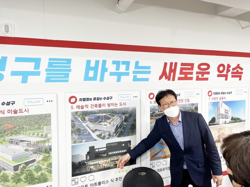 김 후보는 이날 선거사무소를 방문한 주민들로부터 수성구 발전을 위한 제안과 미래의 재선 구청장에게 바라는 의견 등을 청해 들었다.