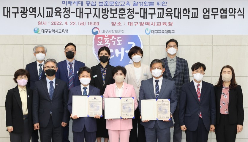 대구시교육청은 22일 여민실에서 학교에서의 보훈문화교육을 활성하고자 대구보훈청, 대구교육대학교와 업무협약식을 체결했다.