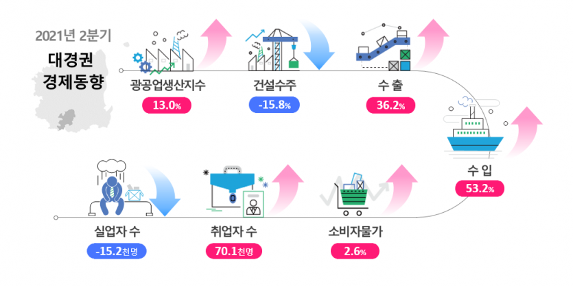 2021 2분기 부문별 경제동향으로는 대구는 광공업생산으로는 자동차 및 트레일러, 기타 기계 및 장비 등에서 늘어 28.2% 증가했으며 경북은 자동차 및 트레일러, 화학물질 및 화학제품(의약품 제외) 등에서 늘어 9.6% 증가했다.