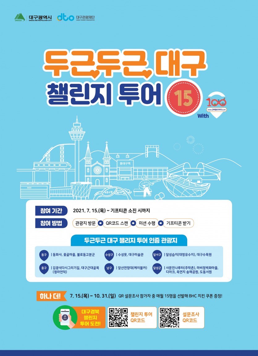 ‘두근두근 챌린지 투어’는 모바일을 이용한 비대면 미션투어 프로그램으로, 대구·경북이 공동으로 추진하고 있으며 대구관광지 15곳과 경북관광지 100곳을 방문하고 여행자 개인 휴대폰으로 관광지에 설치된 QR코드 스캔만으로도 손쉽게 챌린지에 참여할 수 있다.
