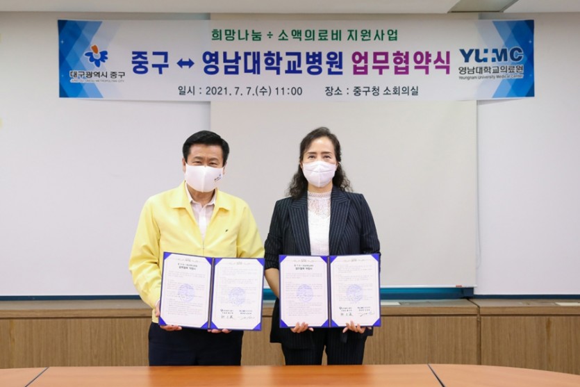 영남대병원(병원장 김성호)은 지난 7일 대구시 중구청과 ‘희망나눔 소액의료비 지원사업’ 관련 업무 협약을 체결했다고 밝혔다.