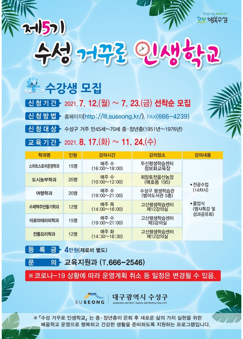 대구 수성구가 오는 12일부터 23일까지 중․장년층의 삶의 가치 실현을 위한 ‘제5기 수성 거꾸로 인생학교’ 수강생을 모집한다.