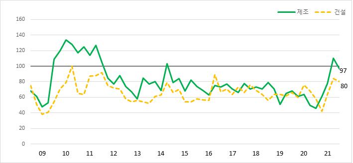 2021년도 3/4분기 기업경기전망치 제조업 97, 건설업 80