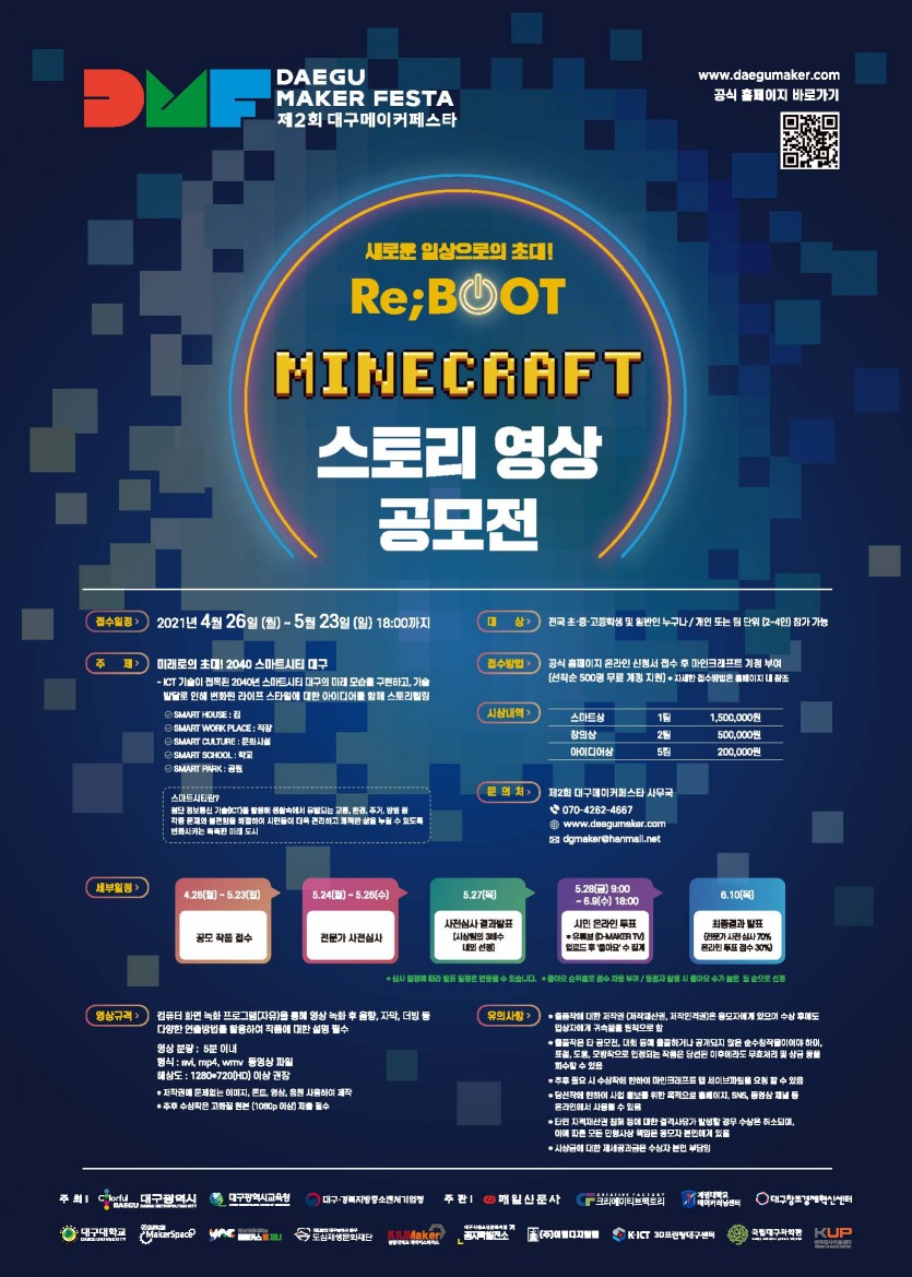 4월~5월 중에는 ‘메이커 온라인 영상 공모전’, ‘2040 스마트시티 대구 마인크래프트 공모전’, 우리나라 청소년들과 해외 청소년들이 온라인으로 만나 각국의 다양한 사회 및 환경문제, 글로벌 이슈를 함께 고민하고 문제를 해결해 보는 글로벌 유스(youth) 온라인 메이커톤 등 다양한 온라인 프로그램이 개최될 예정이다.