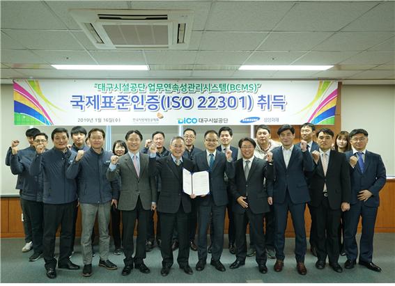대구시설공단은 사업 전 분야에 걸쳐 업무연속성관리시스템(BCMS)을 구축하고 국제표준인 ISO22301을 인증받아 지난 16일 공단 5층 회의실에서 인증수여식을 개최했다.